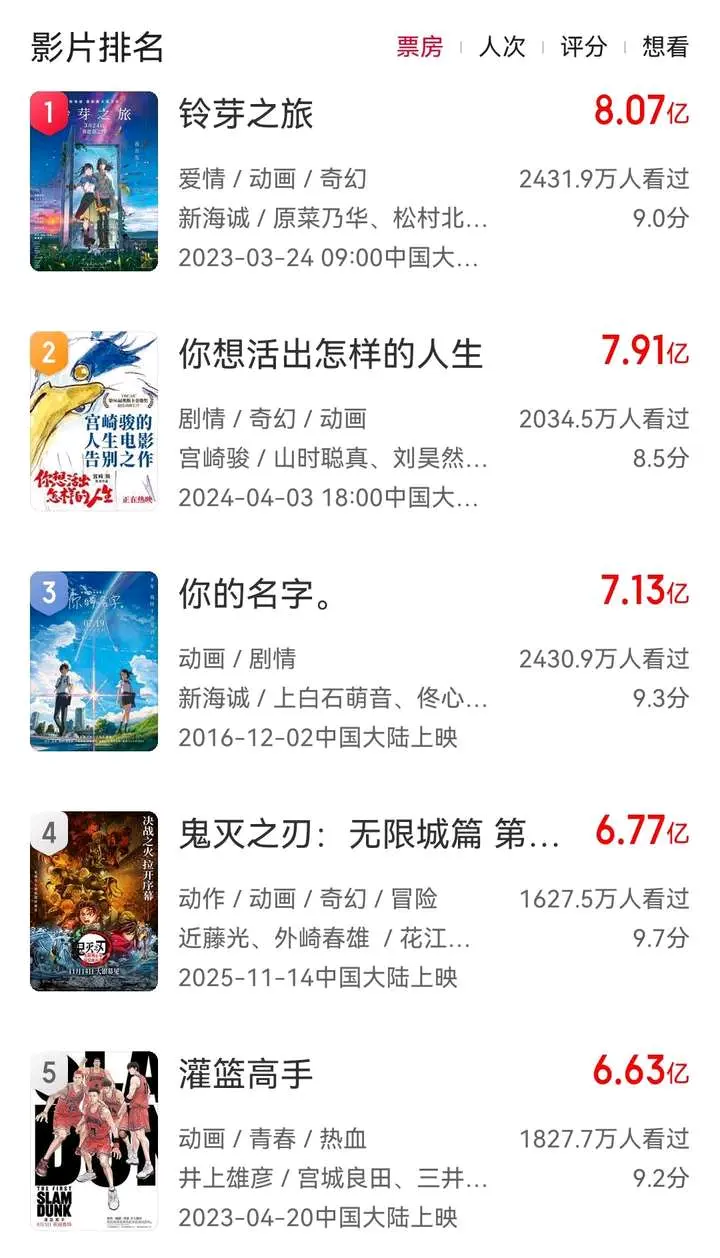 2. 前作口碑与IP影响力差距:《哪吒1》曾斩获50.35亿票房曾是国内票房年冠,《疯狂动物城》前作全球票房10.25亿美元且豆瓣9.3分,两者均积累了跨圈层的高口碑和庞大受众,续作天然自带高市场预期。《鬼灭之刃》系列只在二次元小圈子里人气高,但二次元吗?有名的,声音大钱包瘪,P的大众认知度和影响力远不及前两者。